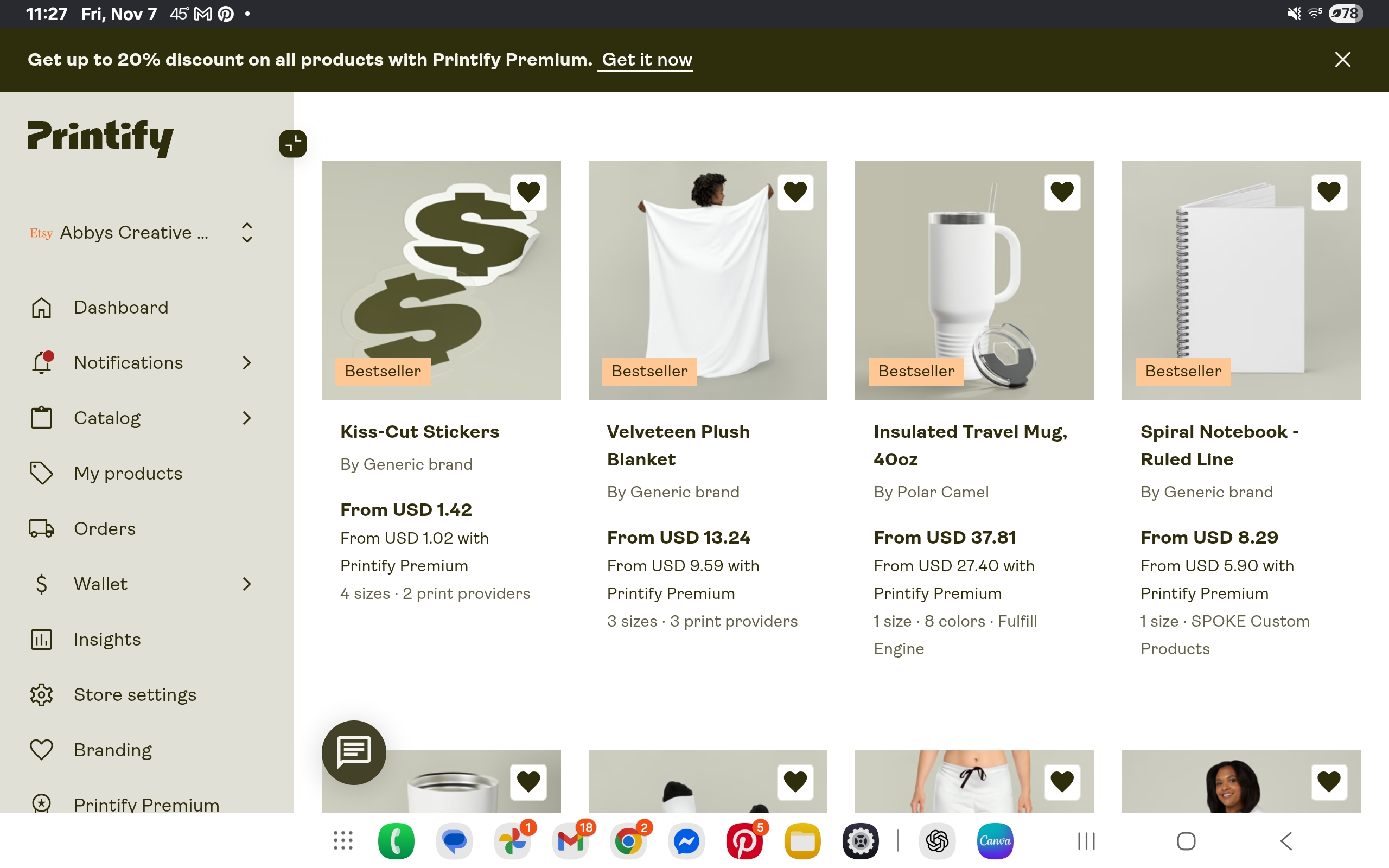 Even though you can start a shop for cheap ($0.20 per listing), Etsy takes a slice of nearly every transaction. Add on Printify or Printful production costs, and profit margins can get slim.