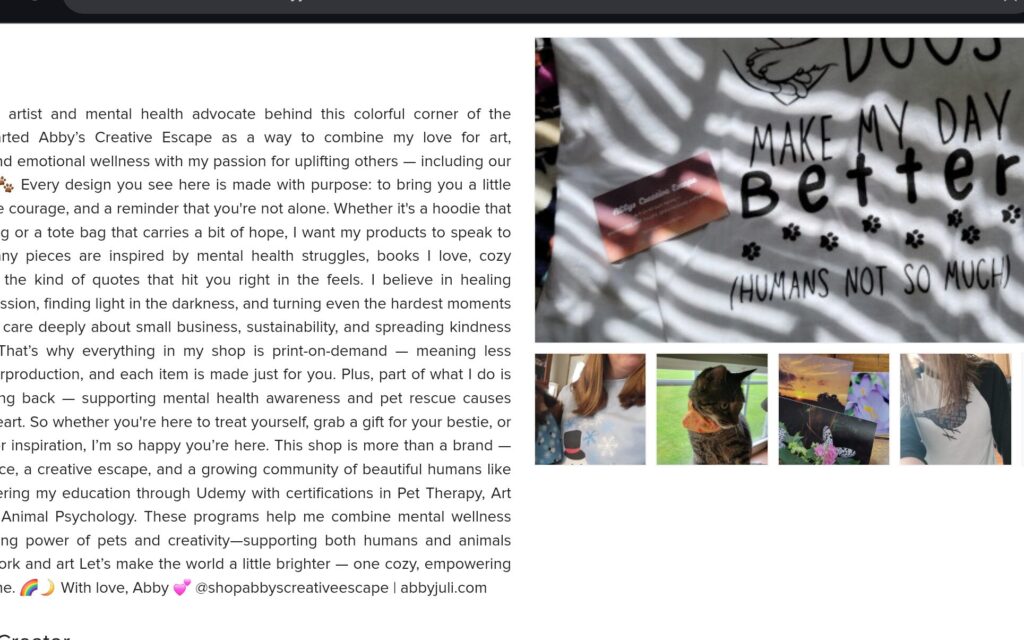 This is your chance to connect with people. Share a bit about your story — how you started, what inspires you, maybe even your pets if they’re part of your brand (mine definitely are 🐶🐱).
