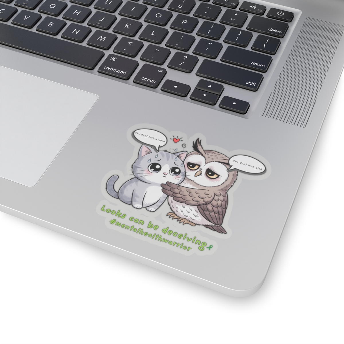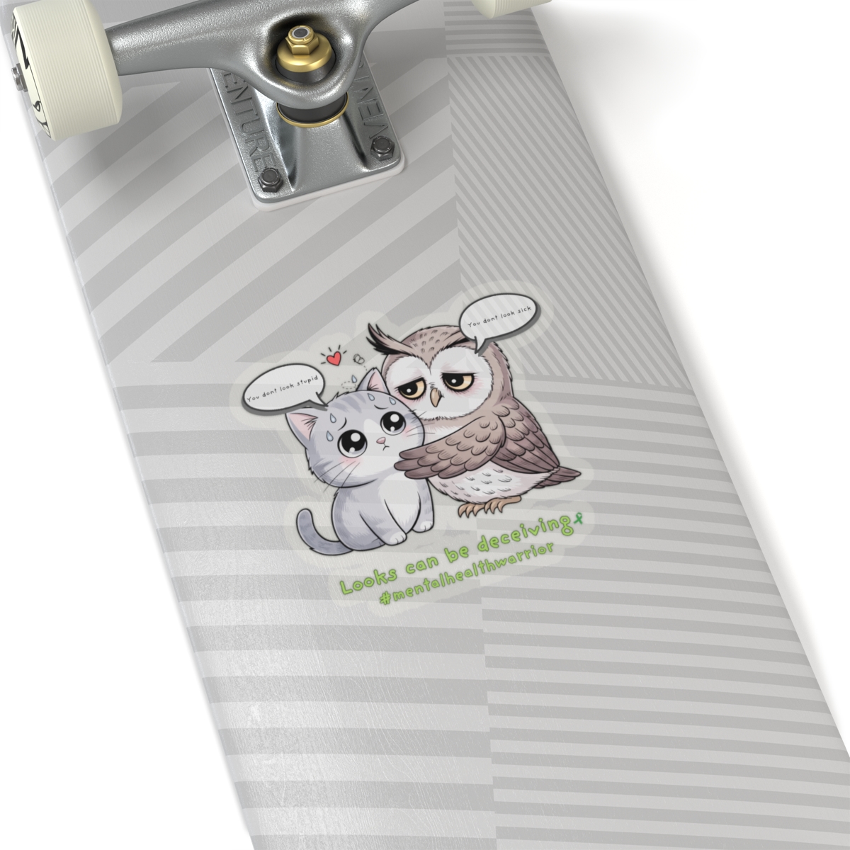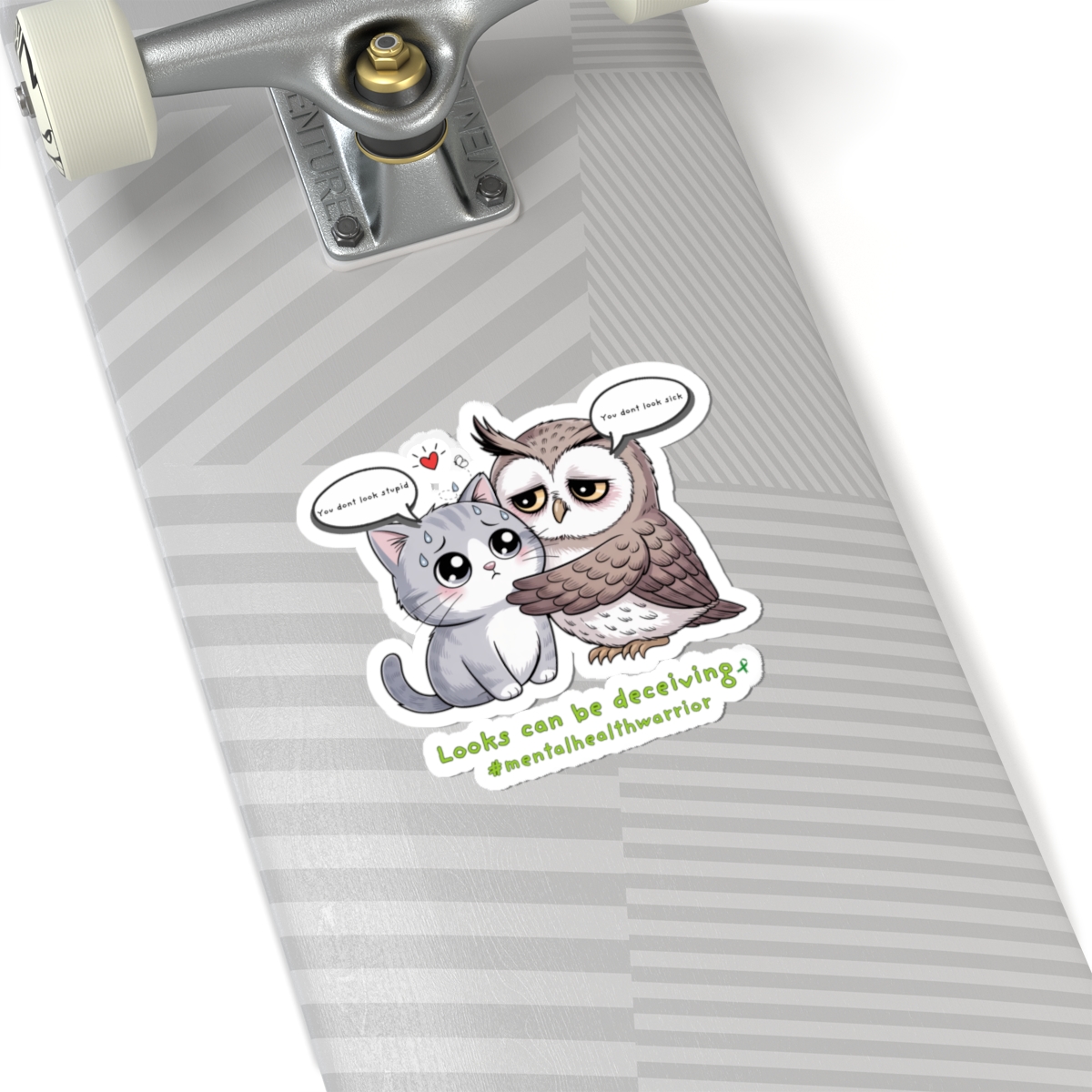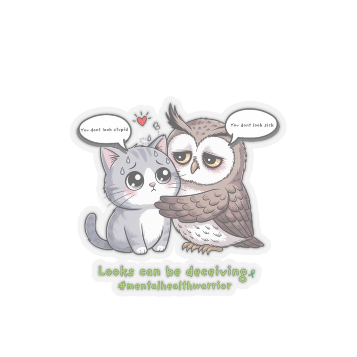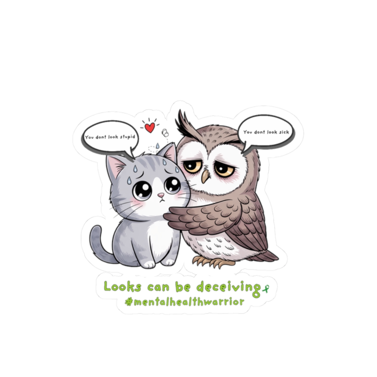 A heartfelt, glossy kiss-cut sticker that pairs a wide-eyed owl embracing a quiet cat with a gentle message about invisible struggles. The illustration balances whimsy with warmth — soft lines, rich colors, and a touch of vulnerability that invites a second look. Stick it on a laptop edge, journal cover, or bedroom mirror to carry a small reminder: appearances don’t tell the whole story. The compact, durable vinyl holds its shine and color, so the tiny scene can travel through daily routines and conversations without losing its charm.