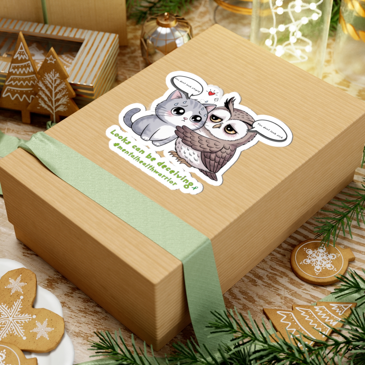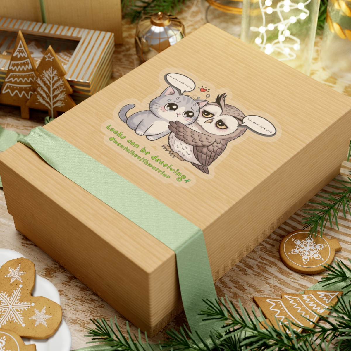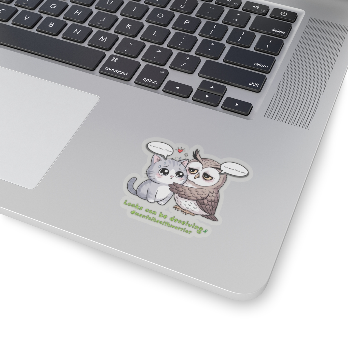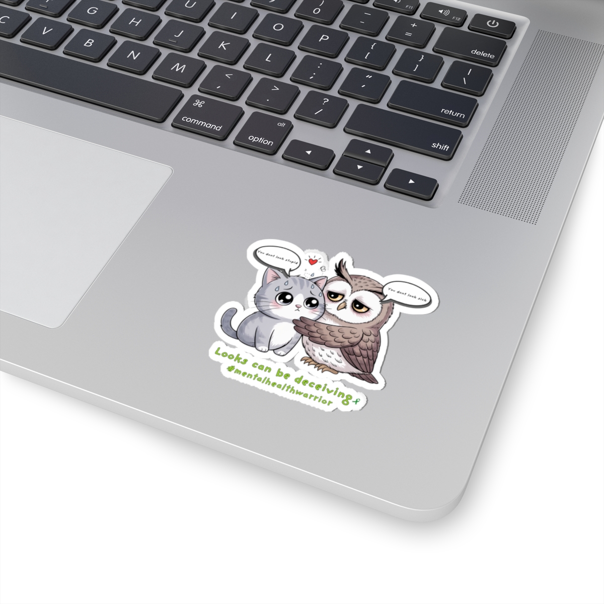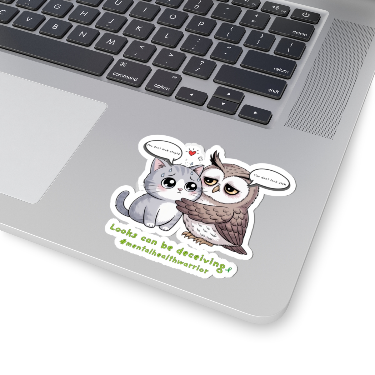 A heartfelt, glossy kiss-cut sticker that pairs a wide-eyed owl embracing a quiet cat with a gentle message about invisible struggles. The illustration balances whimsy with warmth — soft lines, rich colors, and a touch of vulnerability that invites a second look. Stick it on a laptop edge, journal cover, or bedroom mirror to carry a small reminder: appearances don’t tell the whole story. The compact, durable vinyl holds its shine and color, so the tiny scene can travel through daily routines and conversations without losing its charm.