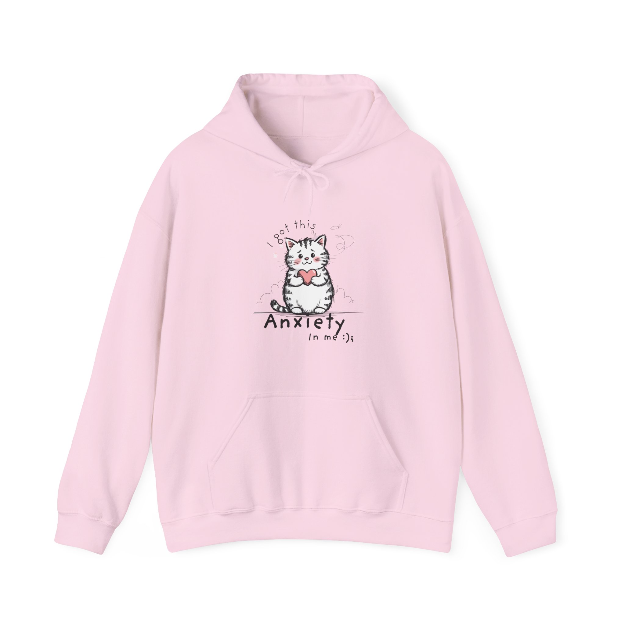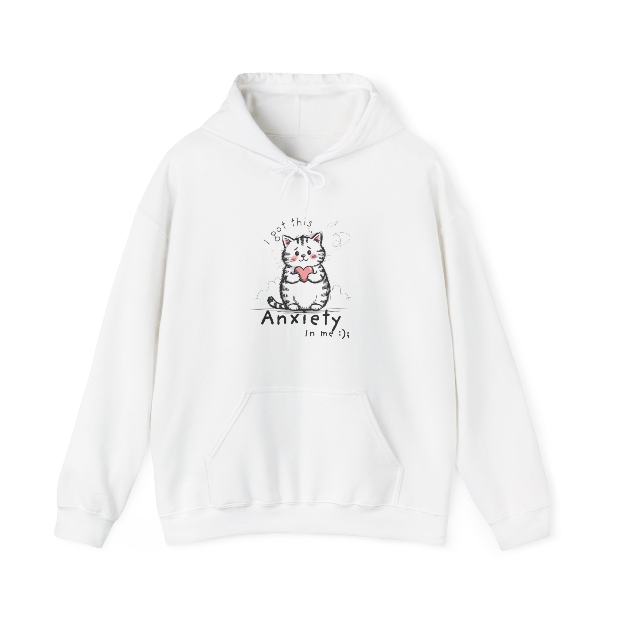 Soft, cozy and quietly expressive — this hoodie wears your feelings with gentle humor. A small, hand-drawn kitten cradling a heart sits over the chest, with the phrase “Anxiety in my chest” scrawled beneath. It’s the kind of sweatshirt you pull on when you want comfort and a little honest company: roomy pouch pocket for cold hands, a double-lined hood with matching drawcord for extra warmth, and a smooth, slightly brushed fabric that holds prints and embroidery beautifully. Wear it at late-night study sessions, low-key coffee dates, or on days you need a soft reminder that you’re seen.