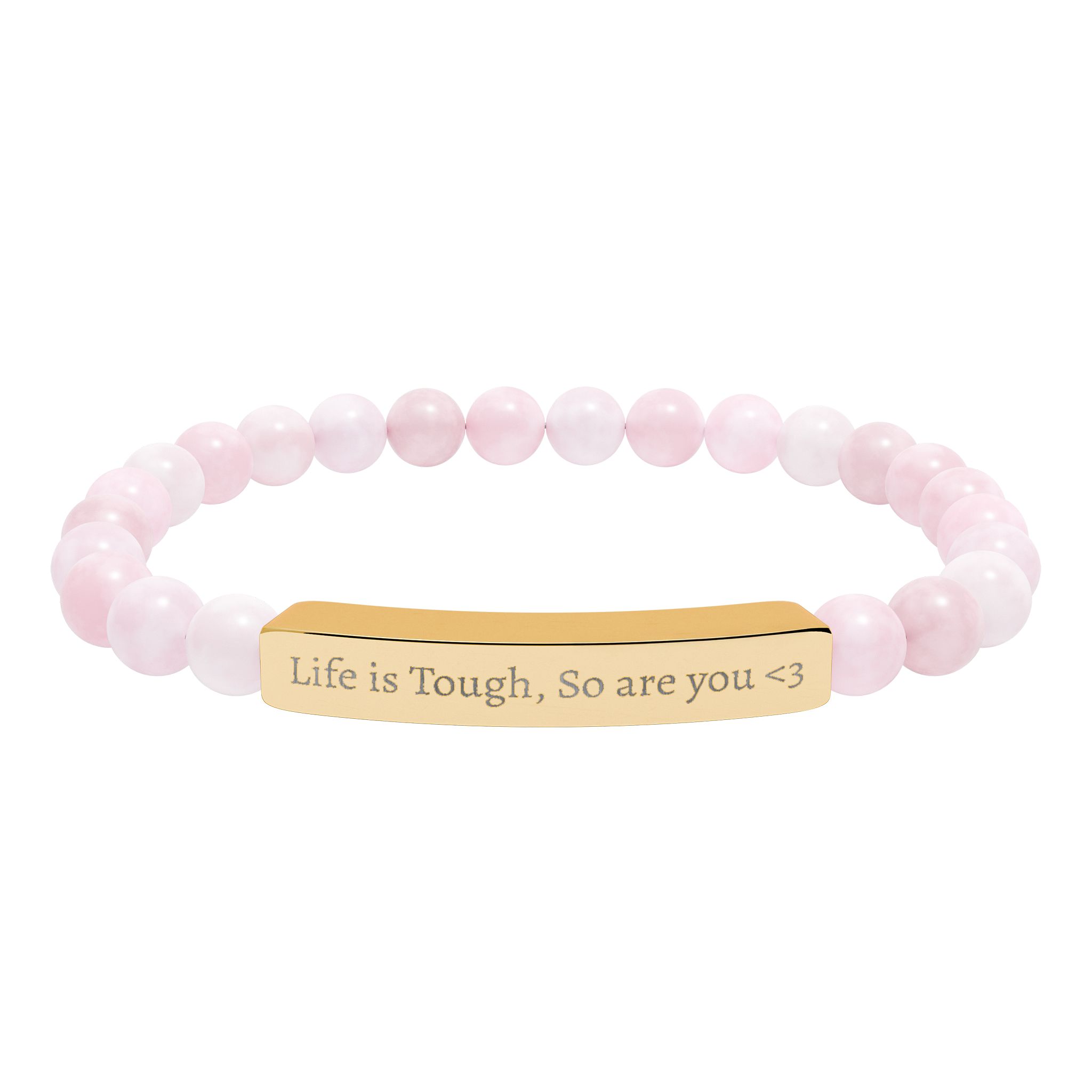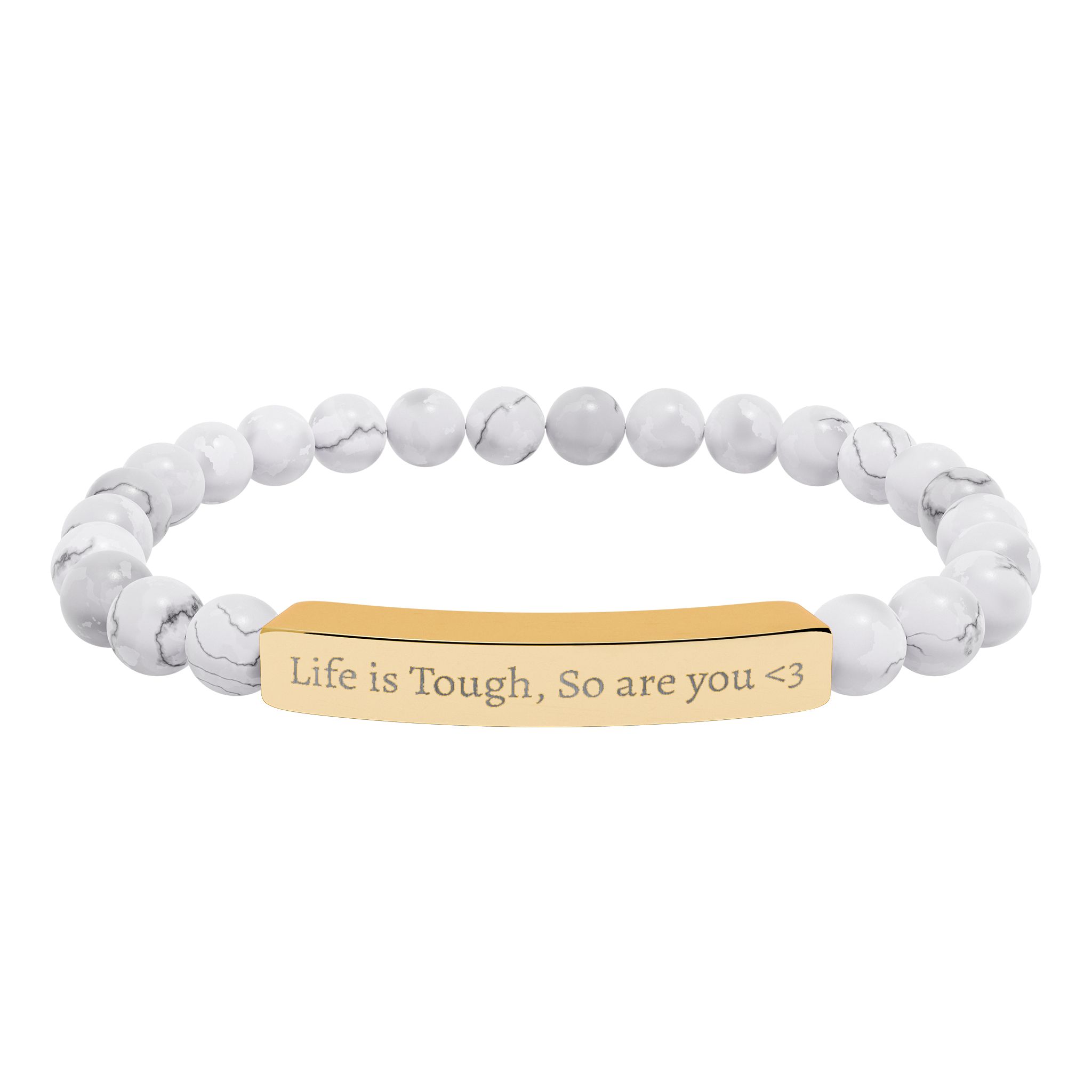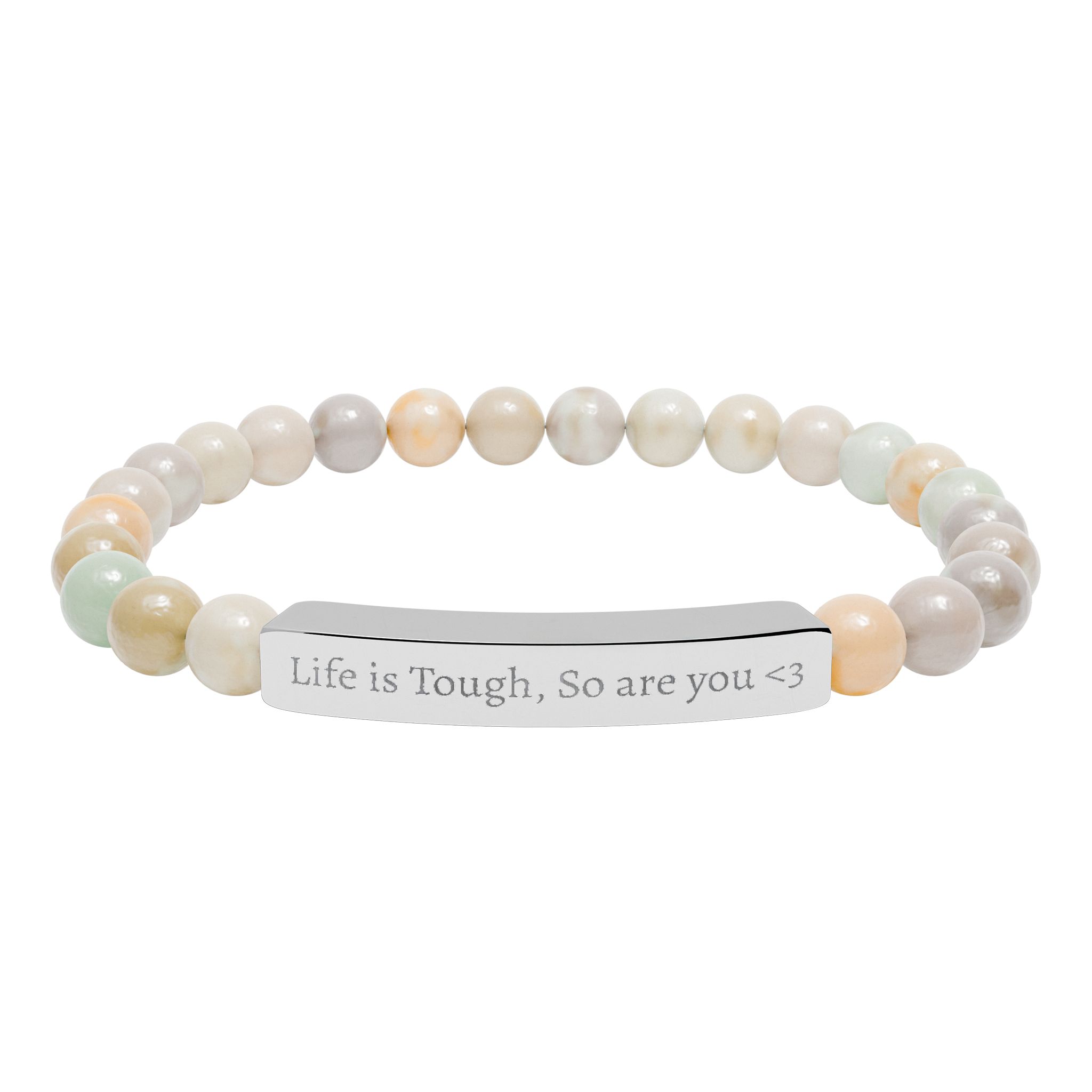 Soft, grounded, and quietly meaningful — this stretch stone bracelet pairs smooth natural beads with a slim engraved stainless steel bar for a look that’s both earthy and refined. The beads bring gentle, muted tones that sit close to the wrist, while the permanently etched bar adds a subtle message that won’t fade with wear. Lightweight and comfortable, it layers easily with other pieces or stands alone as a calm, wearable reminder. Packaged in a white gloss jewelry box with non-tarnish cotton, it arrives ready to tuck into daily life or a memory box.
