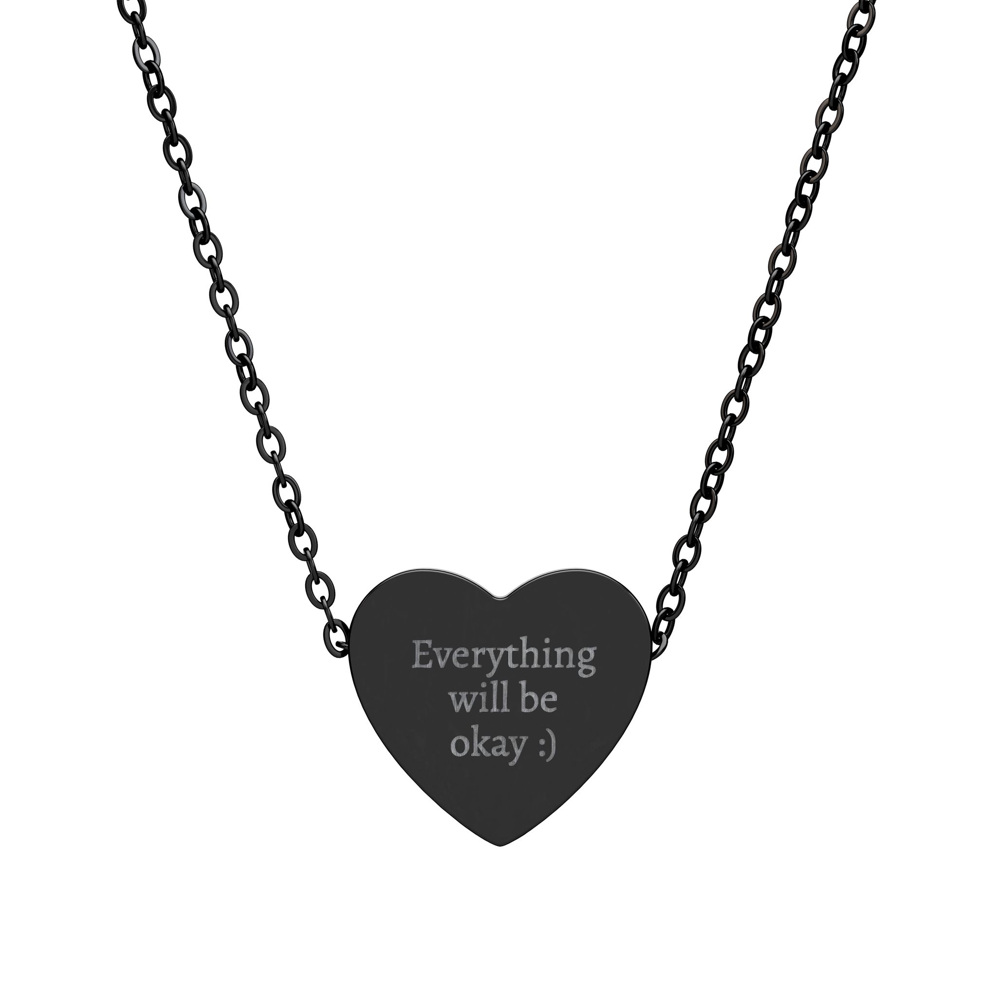 A delicate heart-shaped necklace engraved with a small, reassuring message. Cast from surgical-grade 316L stainless steel and finished with a precise laser-engraved sentiment, this pendant sits close to the collarbone and reads like a quiet note of comfort. It comes in natural silver or a contemporary black PVD finish, both resistant to tarnish and skin-friendly for sensitive wearers. At about 16x14mm, the heart is petite but legible, a subtle daily reminder you can wear alone or layer with other chains. The overall impression is intimate and modern — a small talisman for someone who needs a gentle lift.