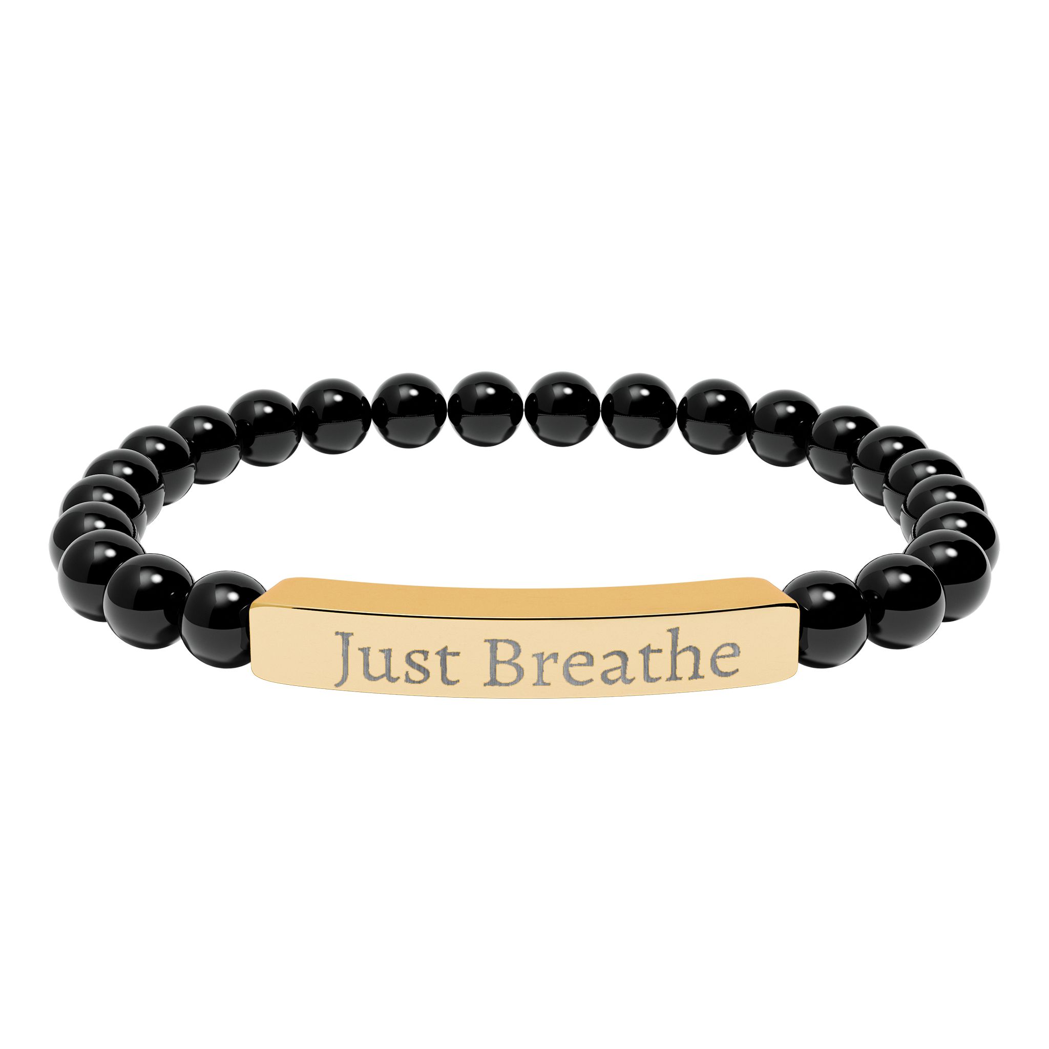 A calm, grounding stretch bracelet made from natural stone beads and a stainless steel engraved bar that reads “Just Breathe.” Soft, muted tones of cream, pale green, and warm taupe beads create a quietly elegant palette that sits close to the wrist. The engraved stainless steel bar is etched for permanence and finished in polished silver (also available with 18K PVD gold coating). Lightweight and hypoallergenic, this bracelet slips on easily and moves with you — a subtle reminder to pause and inhale during busy days or mindful moments. Packaged in a white gloss jewelry box with non-tarnish cotton fiber, it arrives ready to tuck into a jewelry drawer, bedside tray, or travel pouch.