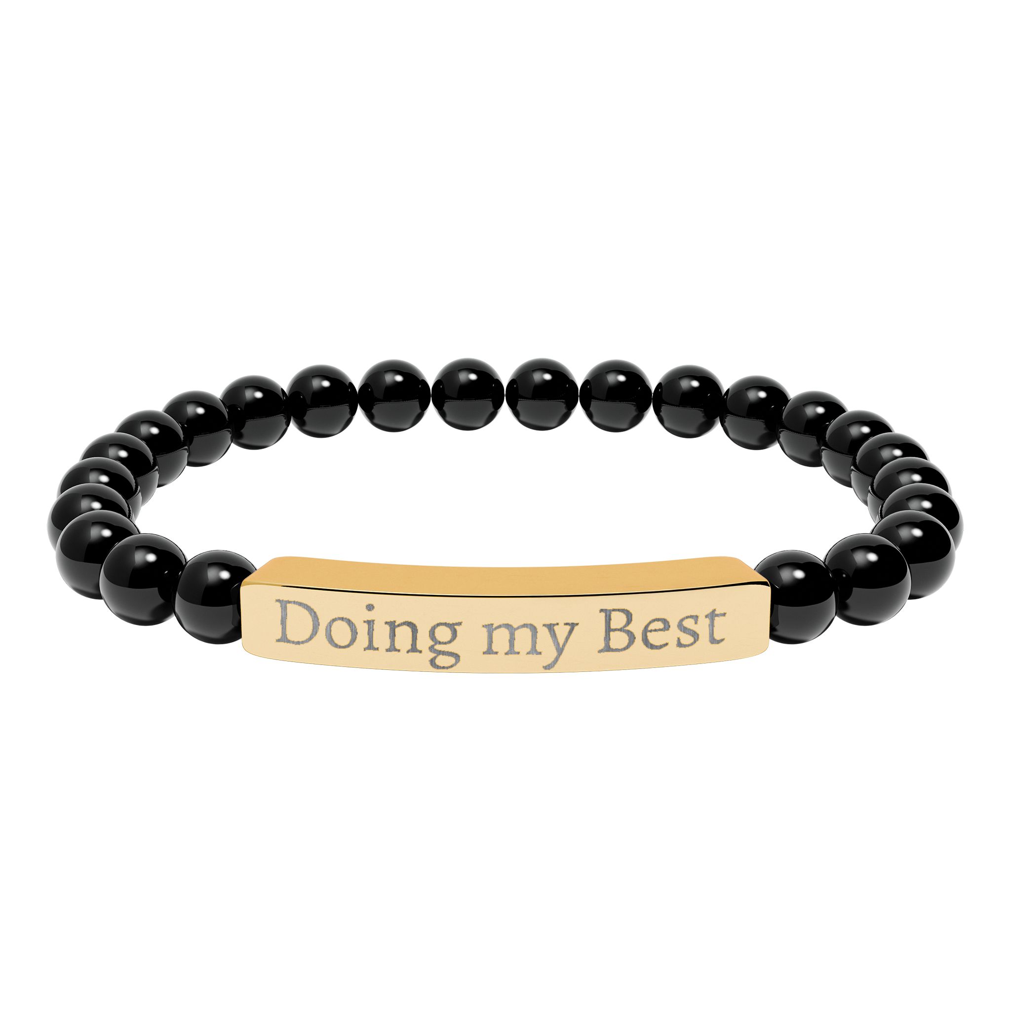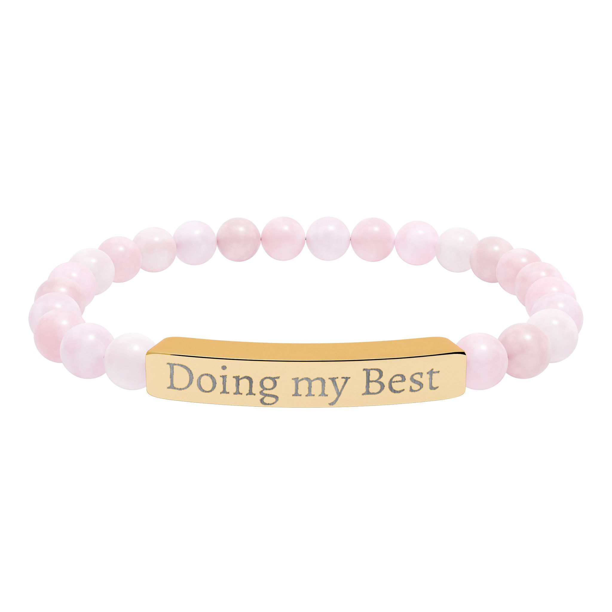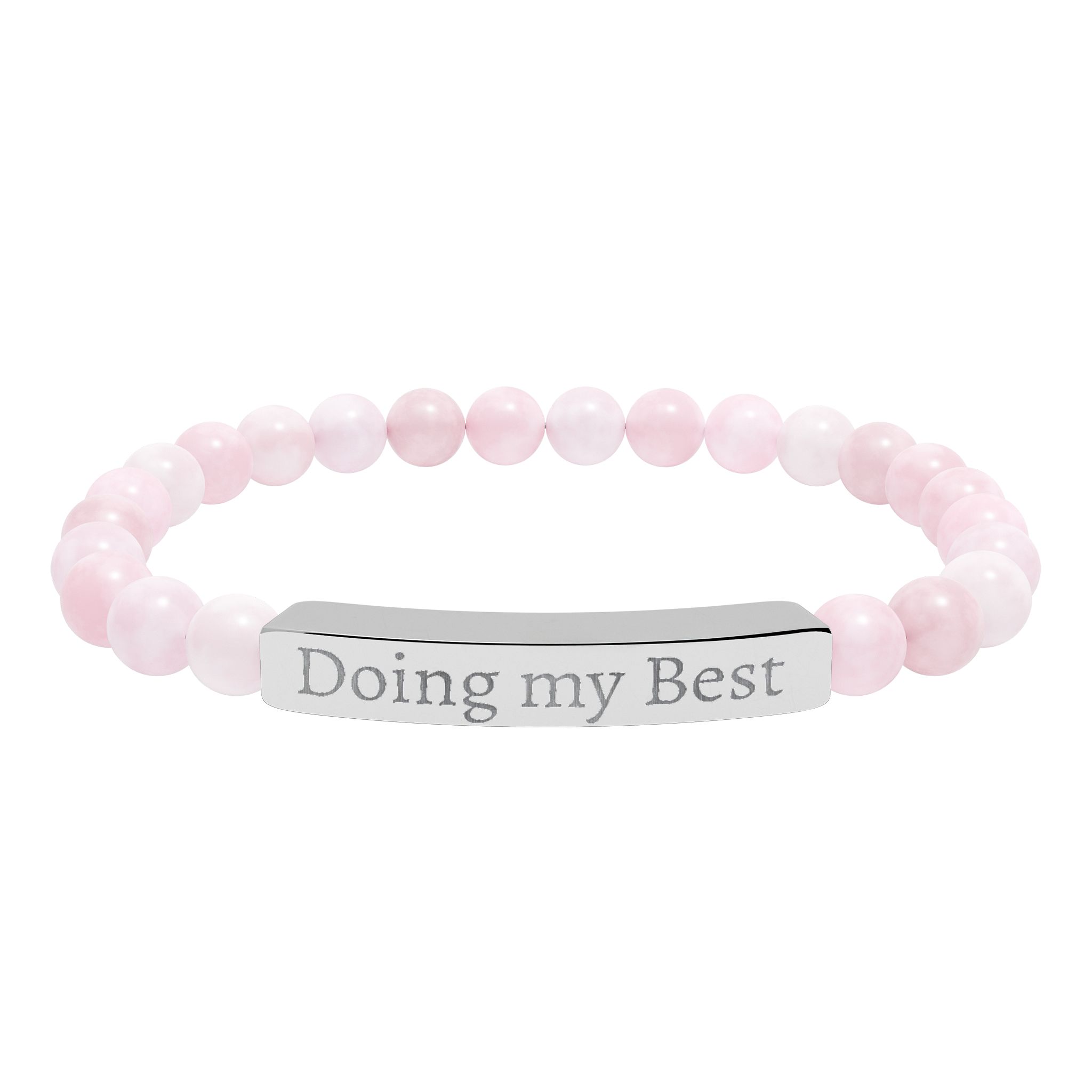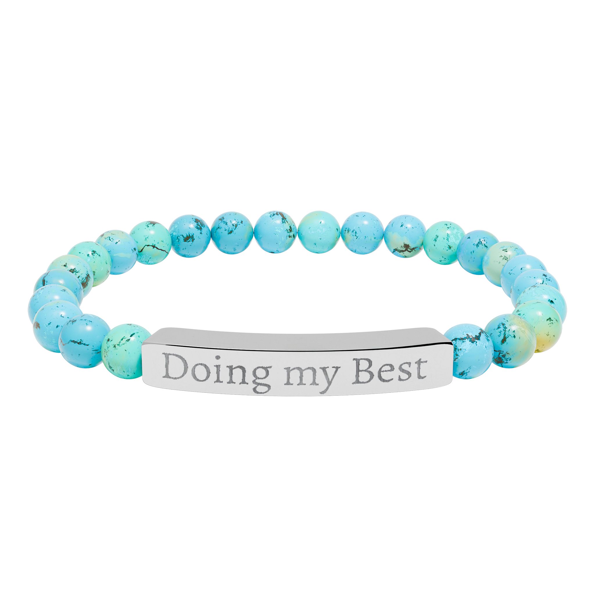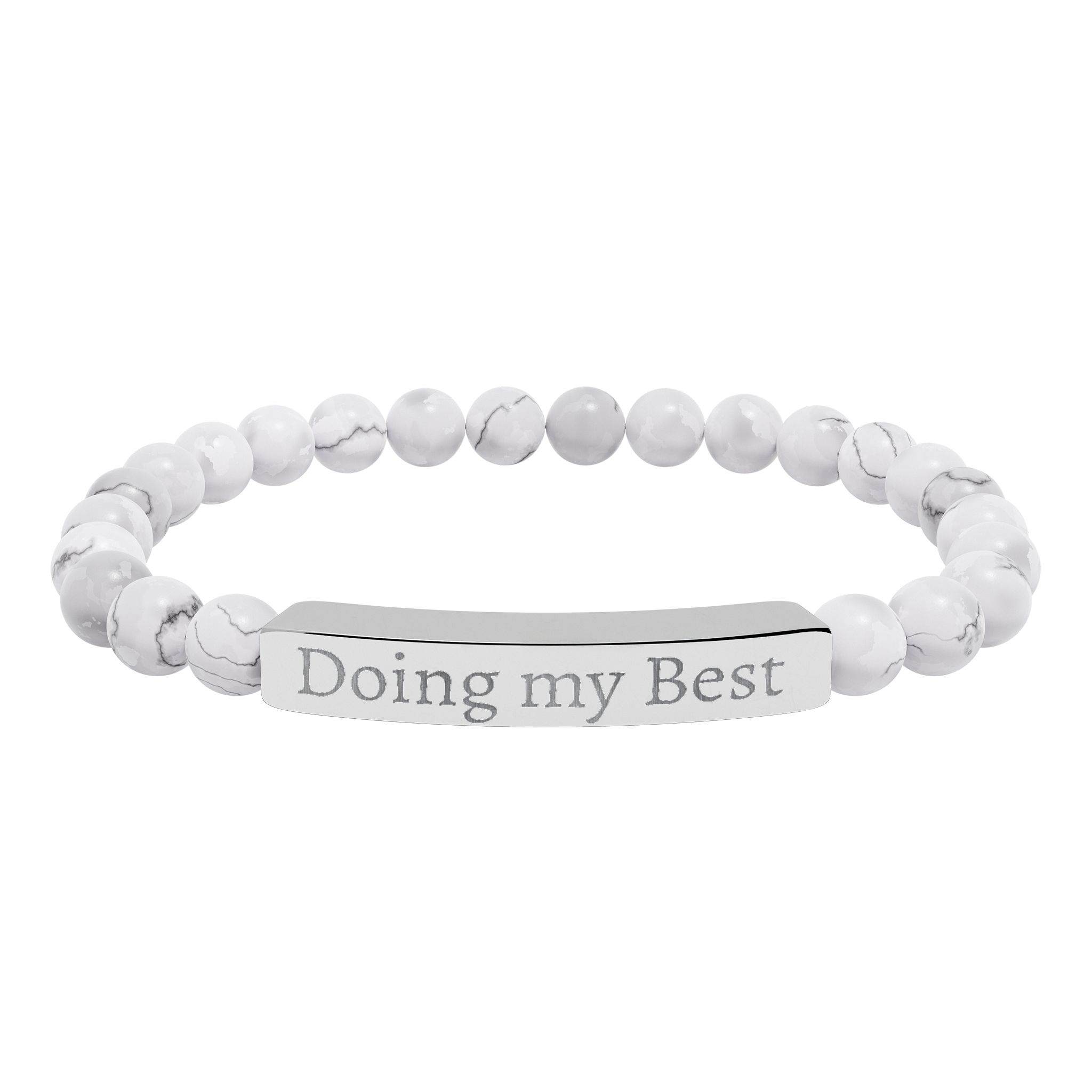 A calming stretch bracelet that pairs smooth natural stone beads with a sleek engraved stainless steel bar. The beads—soft pastel amazonite tones or cool marbled howlite—slide comfortably on and catch quiet light. The engraved bar carries a subtle message in crisp, permanent etching that won’t wear away, giving the piece a refined, lived-in feel. It’s lightweight and low-maintenance: surgical-grade 316L stainless steel resists tarnish and the 18K PVD gold option keeps its warm tone. Arrives in a white gloss jewelry box with non-tarnish cotton for safe keeping.