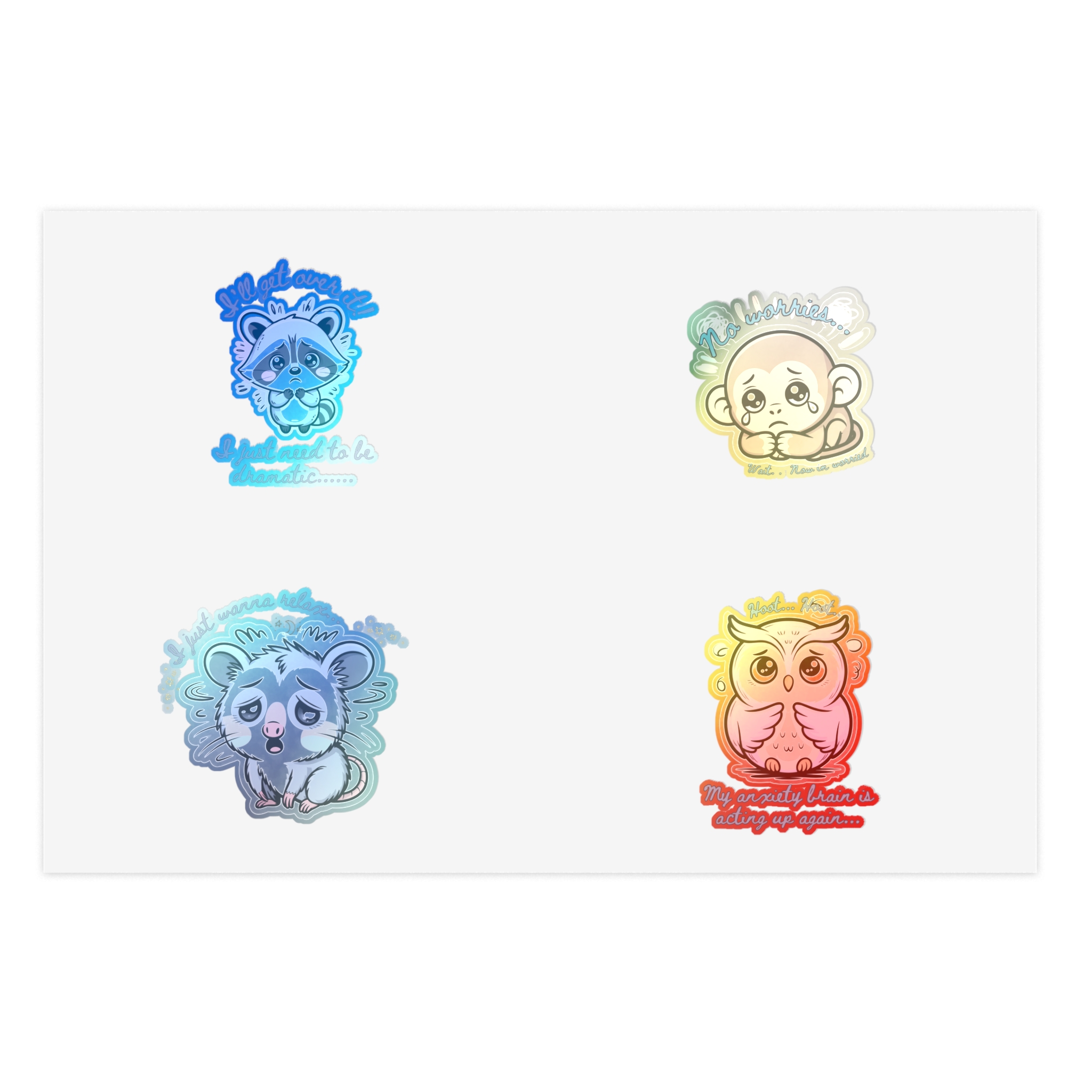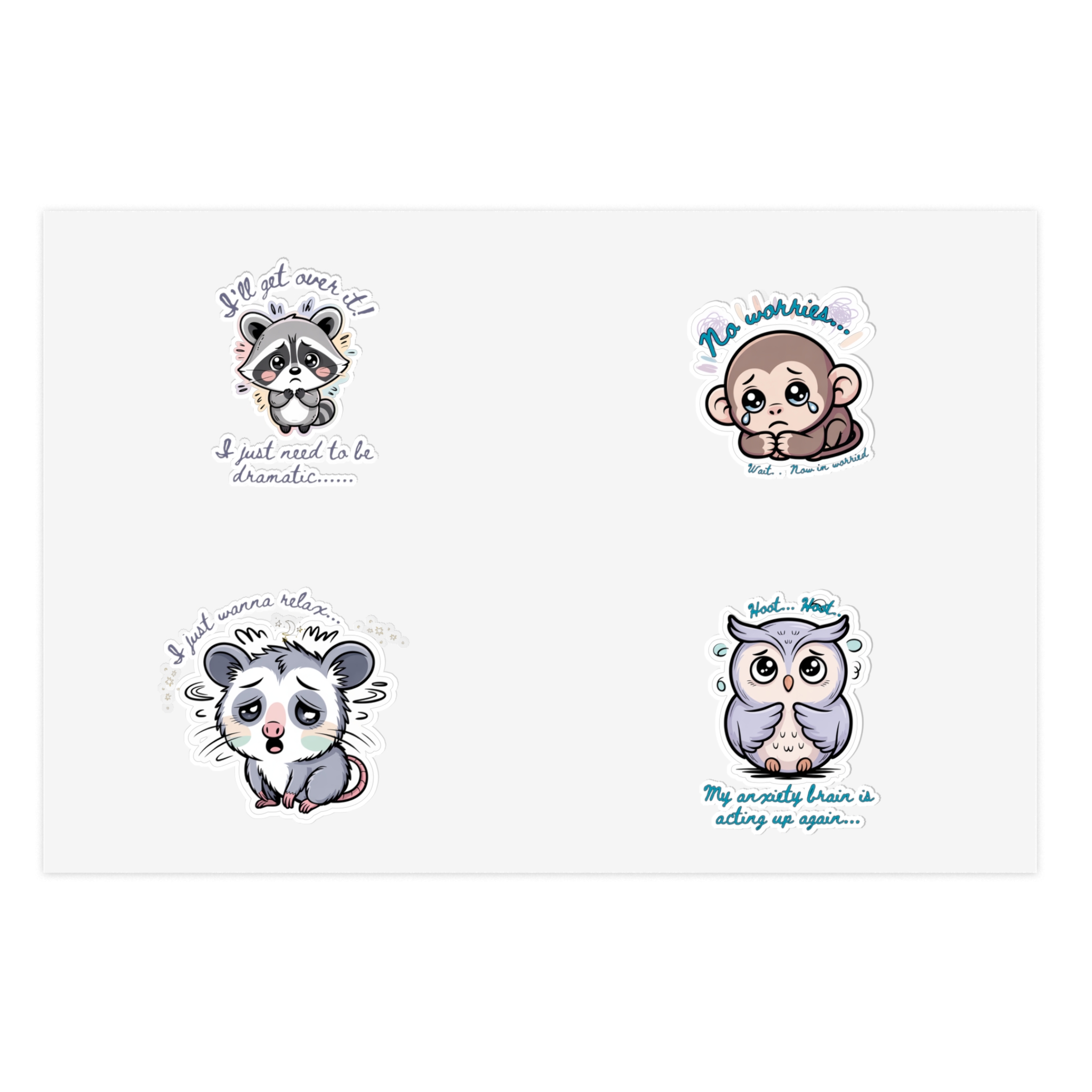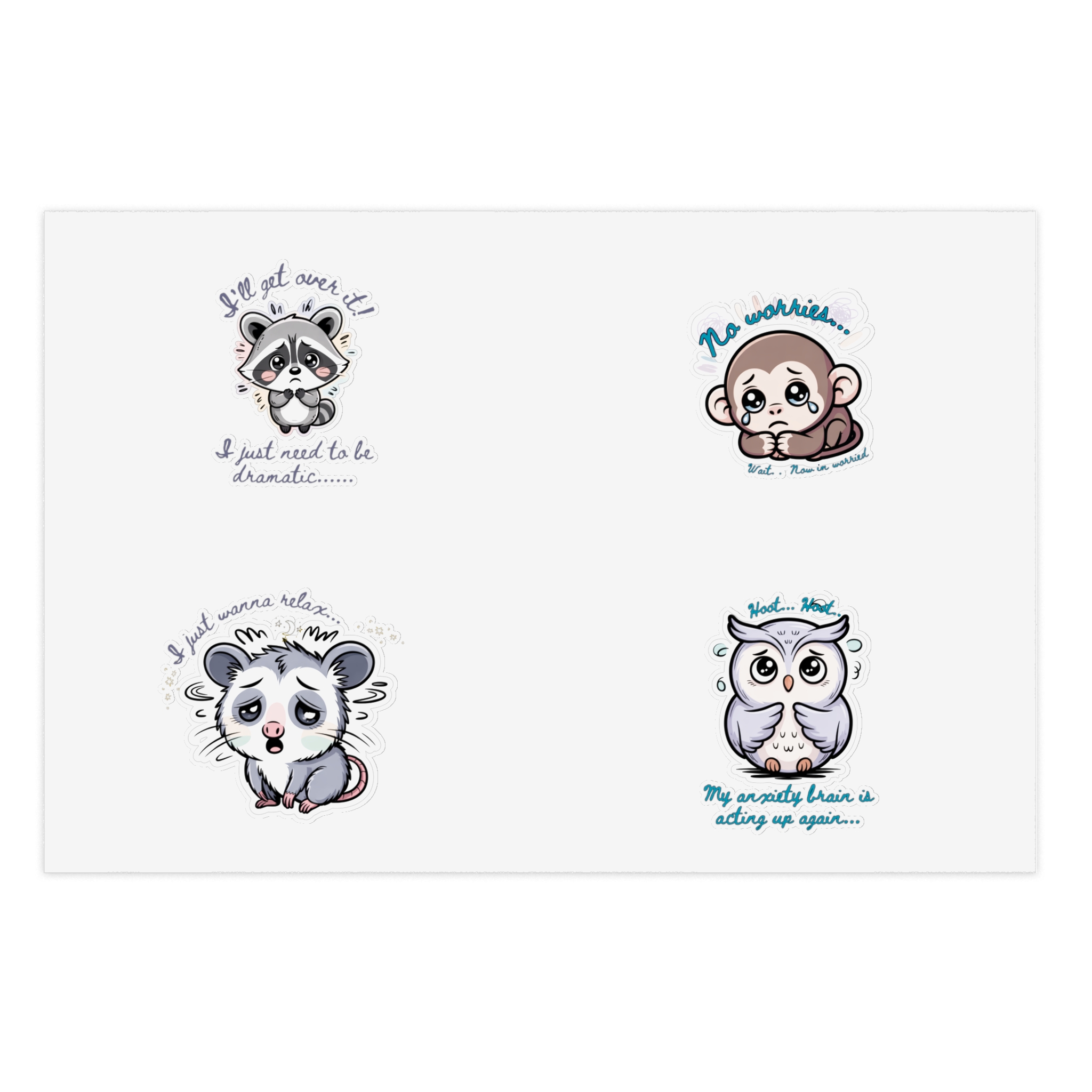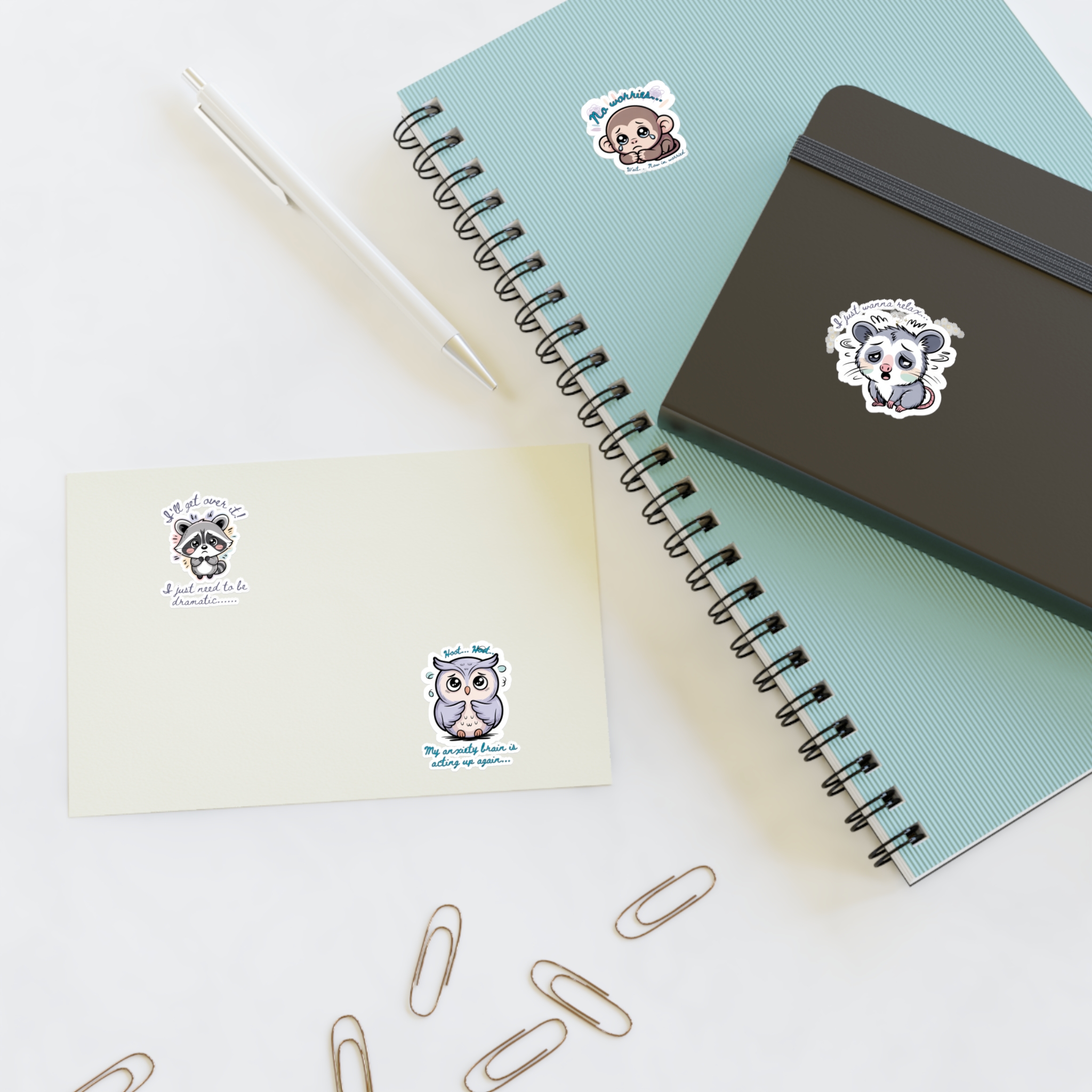 A playful sheet of woodland critters with a sassy, sleepy twist — raccoon, monkey, possum, and owl illustrations paired with sharp, relatable mental-health quips. These stickers bring a wink and a nod to late-night feelings and cozy self-awareness. Stick them on water bottles, journals, laptops, or planners to add quiet humor and a little companionship to everyday surfaces. The matte finish and subtle textures make each critter feel hand-touched, while the sticker’s durable vinyl holds up to daily life and brief outdoor adventures. Whether layered in a sticker collection or given a place of honor on a mug, these sheets invite a moment of soft laughter and recognition when you need it most.